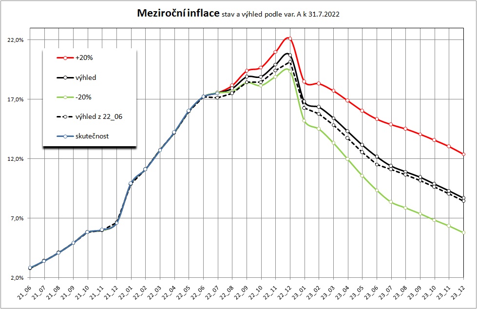 V červenci se výhled proti červnu o něco málo zhoršil (meziroční inflace měla podle výhledu z dat k 30.6.2022 poklesnout na 17,1%)
